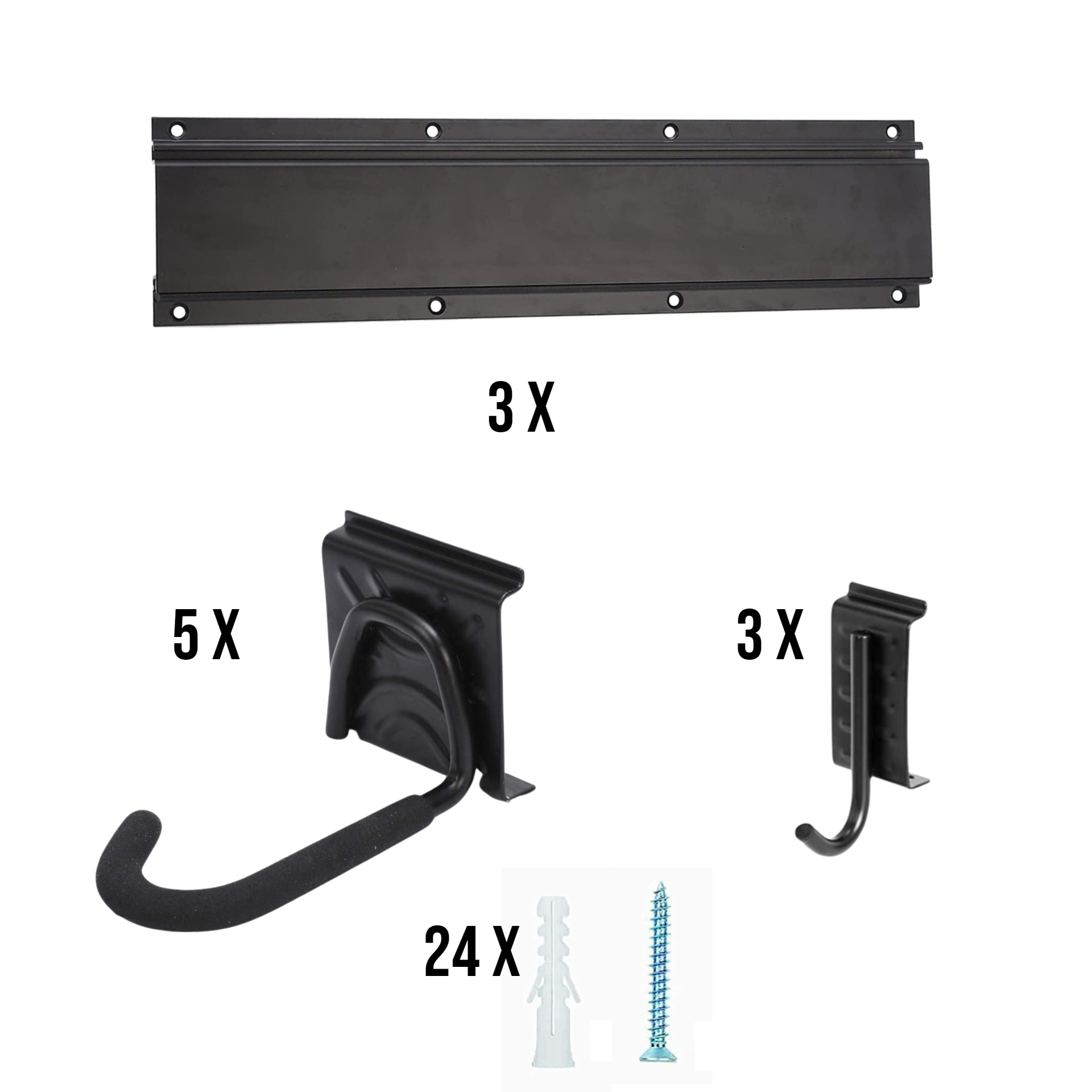 Die drei Grundschienen können entweder nebeneinander oder an verschiedenen Stellen/Räumen verwendet werden, z.B. eine Schiene für Erwachsenenfahrräder, eine Schiene für Kinderfahrräder und eine Schiene für sämtliches Zubehör, wie Fahrradhelme und fluoreszierende Jacken. So kann dieses multifunktionale Aufhängungssystem von der ganzen Familie genutzt werden. Die Schienen sind einfach zu montieren und Sie können die Haken selbst auf die drei Montageschienen verteilen. Darüber hinaus sind alle Fahrradhaken mit einem Gummischutz ausgestattet, so dass Ihre Fahrräder nicht beschädigt werden.