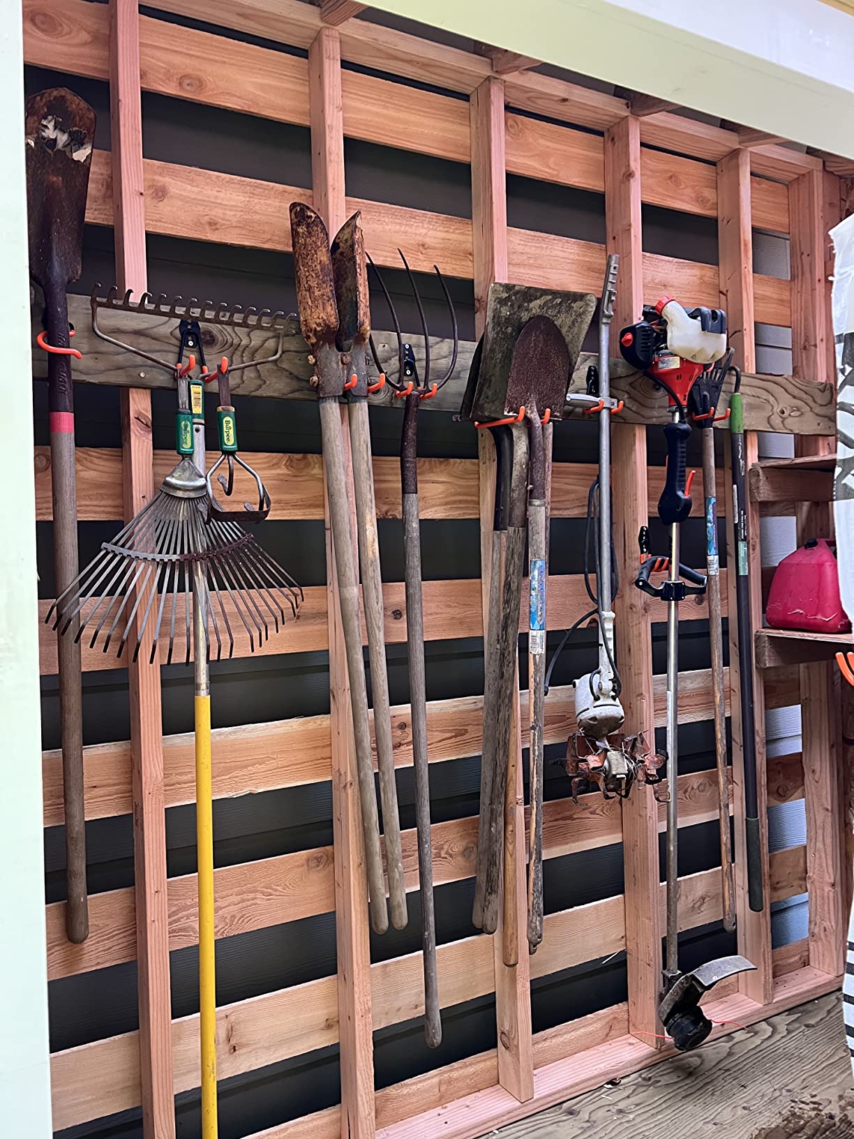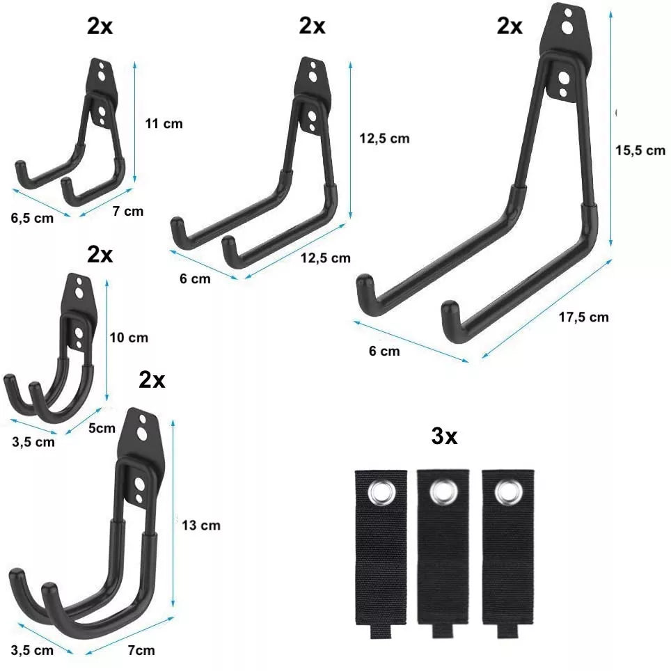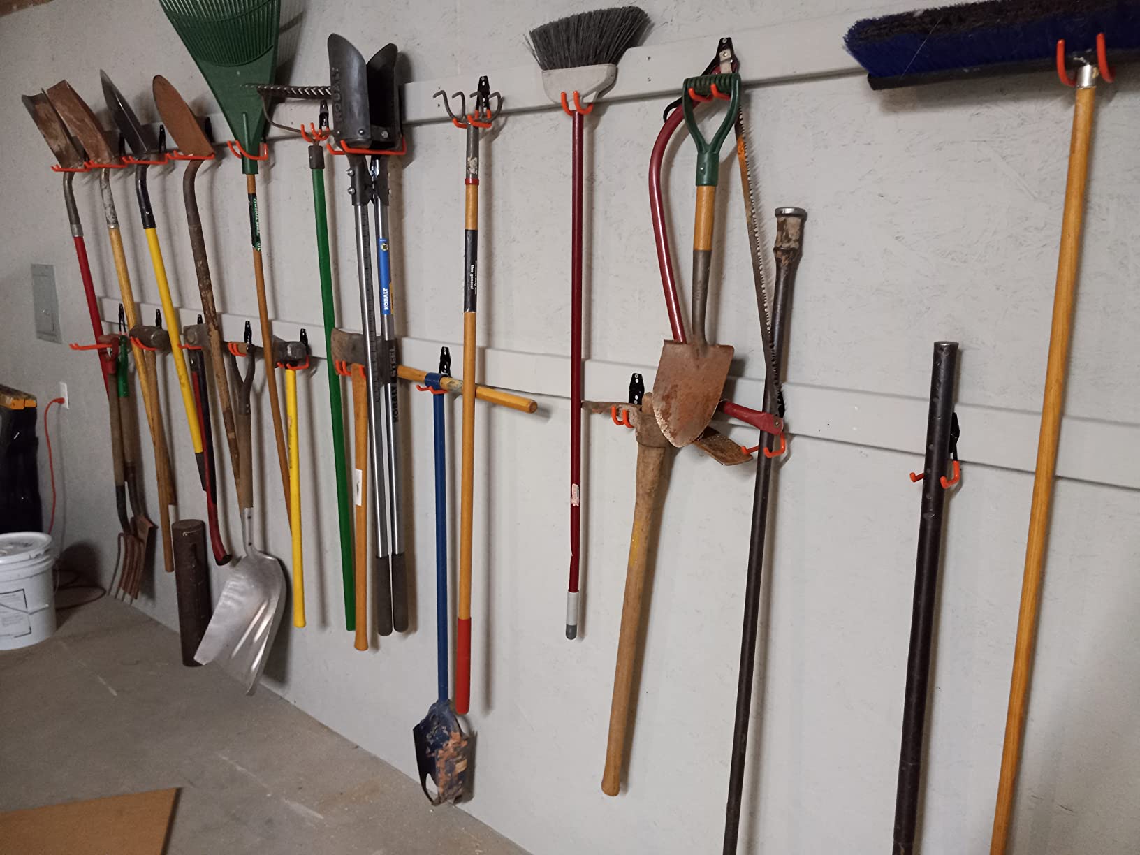 Die verschiedenen Größen der Haken sorgen dafür, dass sie für unterschiedliche Zwecke verwendet werden können. Sowohl schwere Werkzeuge (z. B. Leitern, Spaten, Klappstühle) als auch sperrige Werkzeuge (z. B. Gartenschläuche, Seile) sowie alle Arten von Kleinzubehör können platzsparend verstaut werden.